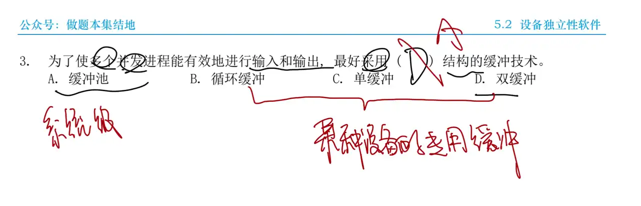 Q:为了使多个并发进程能有效地进行输入和输出,最好采用 ( ) 结构的缓冲技术。