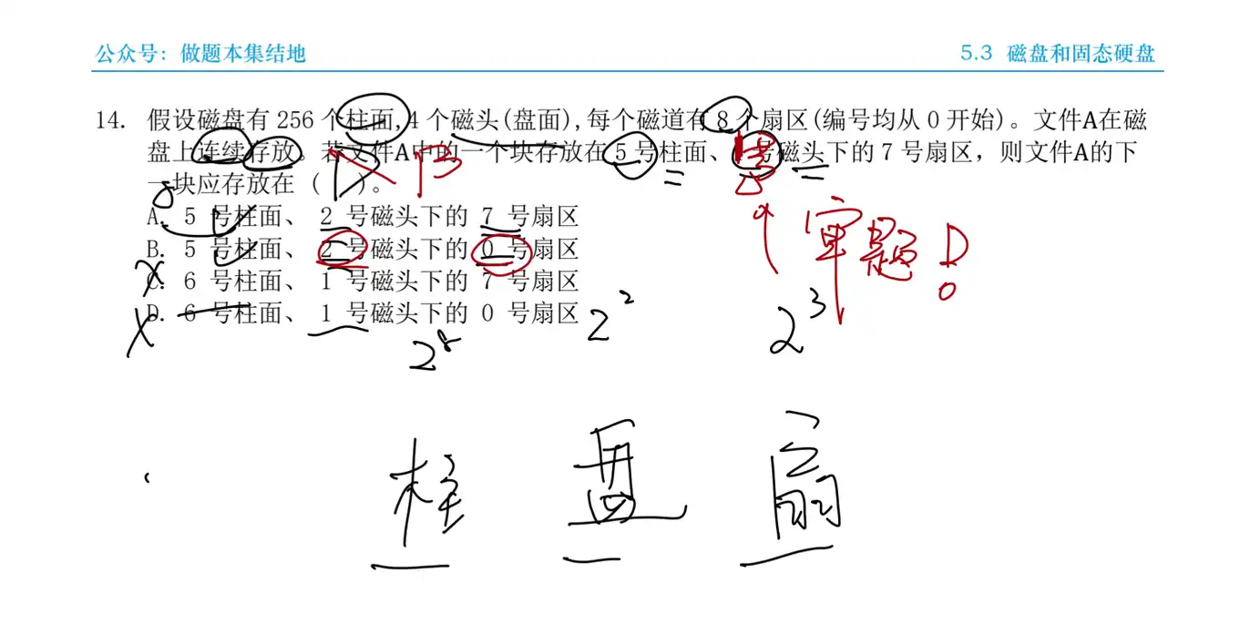Q:假设磁盘有 256 个柱面, 4 个磁头 (盘面), 每个磁道有 8 个扇区 (编号均从 0 开始)。文件A 在磁盘上连续存放。若文件A中的一个块存放在 5 号柱面、 1 号磁头下的 7 号扇区, 则文件A的下一块应存放在 ( ) 。