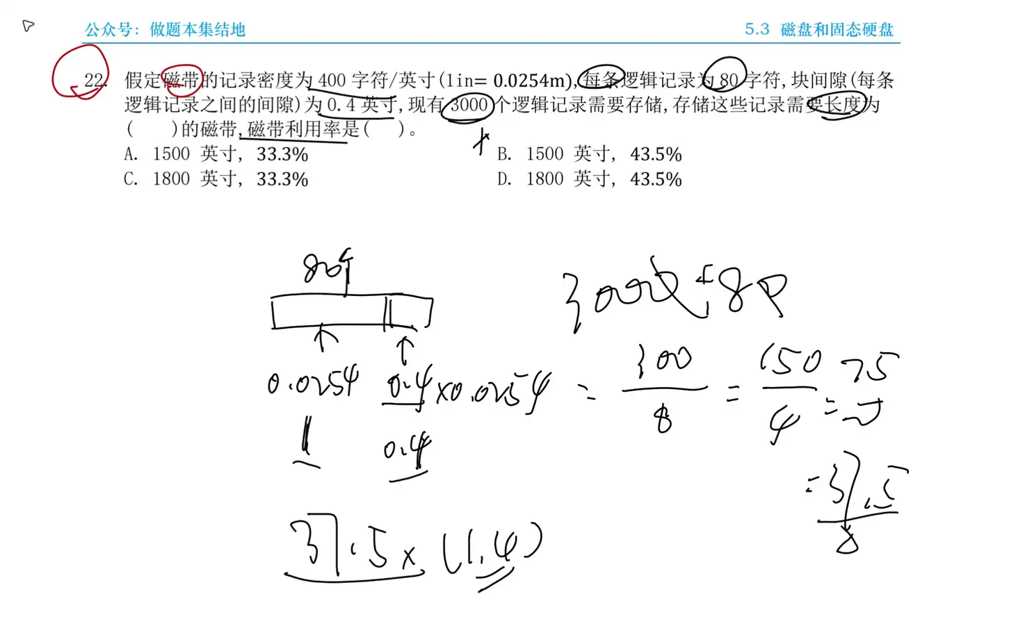题22 题目 Q:假定磁带的记录密度为 400 字符/英寸 ,每条逻辑记录为 80 字符,块间隙 (每条逻辑记录之间的间隙) 为 0.4 英寸, 现有 3000 个逻辑记录需要存储, 存储这些记录需要长度为 ( ) 的磁带,磁带利用率是 ( ) 。 A. 1500 英寸, B. 1500 英寸, C. 1800 英寸, D. 1800 英寸, 分析 A:一个逻辑记录所占的磁带长度为 英寸,因此存储 3000 条逻辑记录需要的磁带长度为 英寸,利用率为 。 解 C