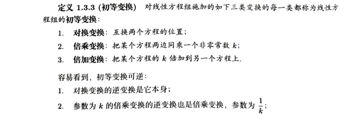 定义 1.3.3 (初等变换) 对线性方程组施加的如下三类变换的每一类都称为线性方