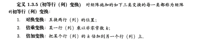 定义 1.3.5 (初等行 (列) 变换) 对矩阵施加的如下三类变换的每一类都称为矩阵的初等行(列)变换: