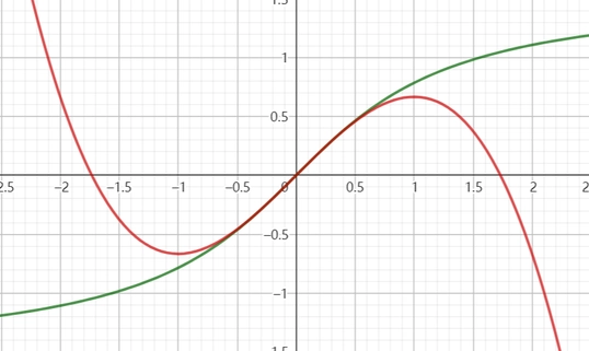 当 指数-1用直接切线贴合 指数-1用直接切线贴合 ;; ,幂函数 ,e的指数,也就是全部都带一个-1,然后用正比例函数x的直线模拟 三角用二三次函数贴合 三角用二三次函数贴合 ;; 和 特别地,注意到上面的 的等价无穷小求导即是我们记忆的 还有 对于lnx它和x的组合可以用2次函数进行拟合 对于 它和 的组合可以用 2 次函数进行拟合 ;; 反三角函数同样是使用三次函数进行拟合 Q:反三角函数同样是使用三次函数进行拟合 A: (红色,毕竟减了)和 (绿色,毕竟上扬) 对于三角的幂次 对于三角的幂次 ;;