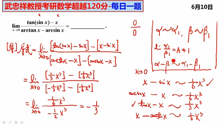 Q:两组等价无穷小的和差在什么条件下,仍是等价无穷小 A:两者是同阶的无穷小,就可以做加减乘除,注意下面的负号 若 且 则 若 且 则 等价无穷小的差什么时候还是等价无穷小 考虑下面这个求极限 Q:如果,又有,这两个等价无穷小作差和,在什么条件下才仍然是等价无穷小 A:需要,