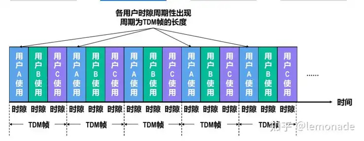 时分复用 时分复用的所有用户在不同的时间占用同样的频带 将时间划分为时隙,每个时分复用的用户在其时隙内独占传输媒体的资源进行通信。 开车的限行策略 各用户时隙周期性出现周期为 TDM 帧的长度(TDM 帧实际上是一段固定长度的时间,它与数据链路层对等实体间的逻辑通信的 “帧”,是完全不同的概念)