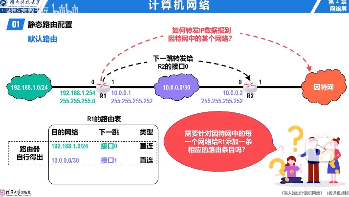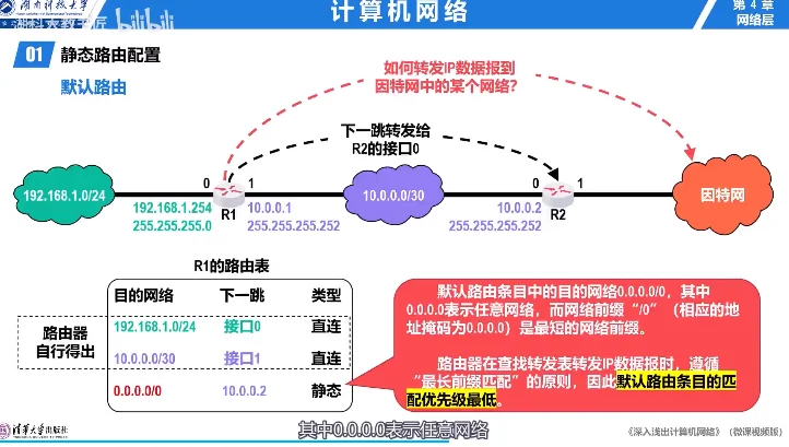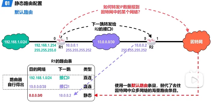 情景是,现在R1要发送出去的目的上的设备太多了,不像上面一样只有几个设备,而是因特网,或者说超级多设备,这个时候,要在所有因特网中的设备的ip地址的映射关系手动写进路由表里就不太现实了