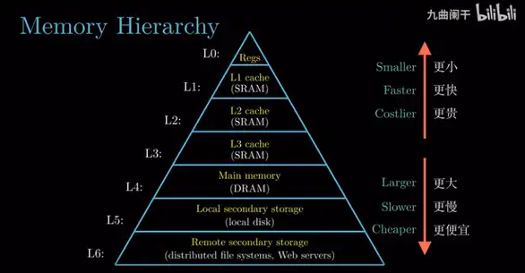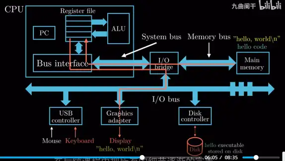 学习视频 1-2.计算机系统漫游 笔记 01:32cpu 结构 program count 程序计数器 实质上是一个大小为一个字的存储区域 一个字: 32 位的机器 4 个字节 64 位的机器 8 个字节 存放某一条指令的地址 处理器执行 pc 存储的指令,然后更新,继续下一条指令 02:24寄存器文件 由一些单字长的寄存器构成 每个寄存器有唯一的认证名字 寄存器是一个临时存放数据的空间 ALU 是什么 04:52 hello 执行时发生了什么(计算机组成视角) 08:13 部件缓存速度金字塔 从上到下,依次为彼此的缓存