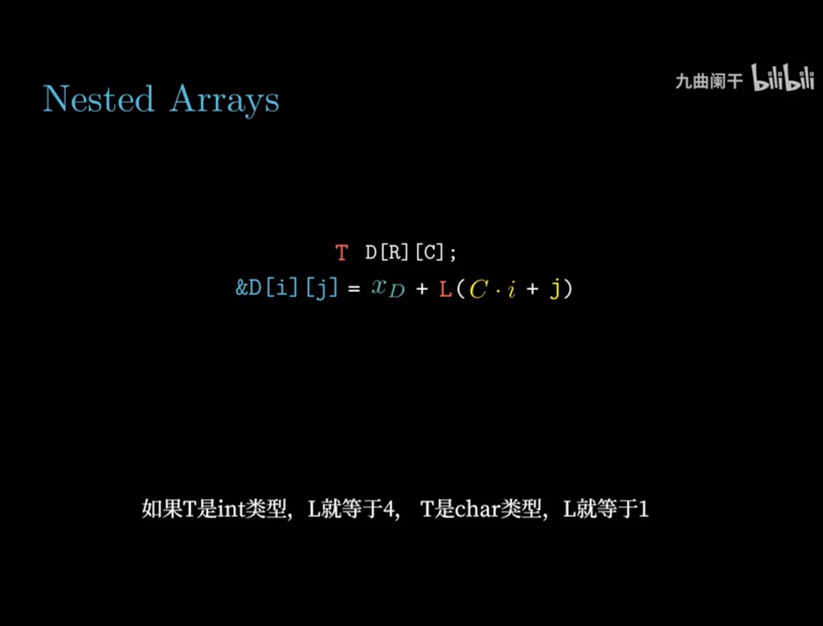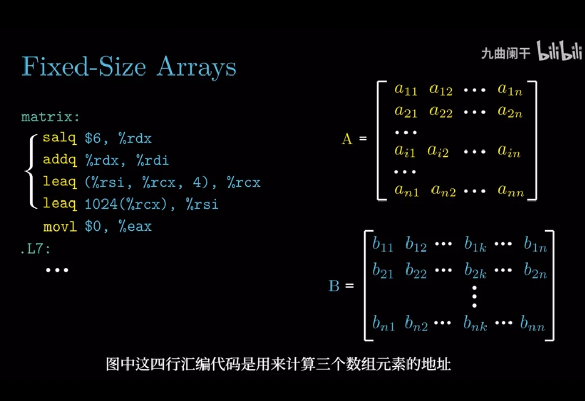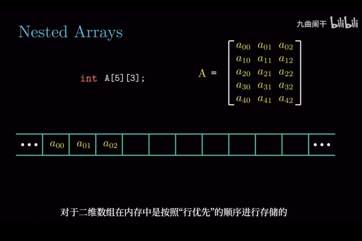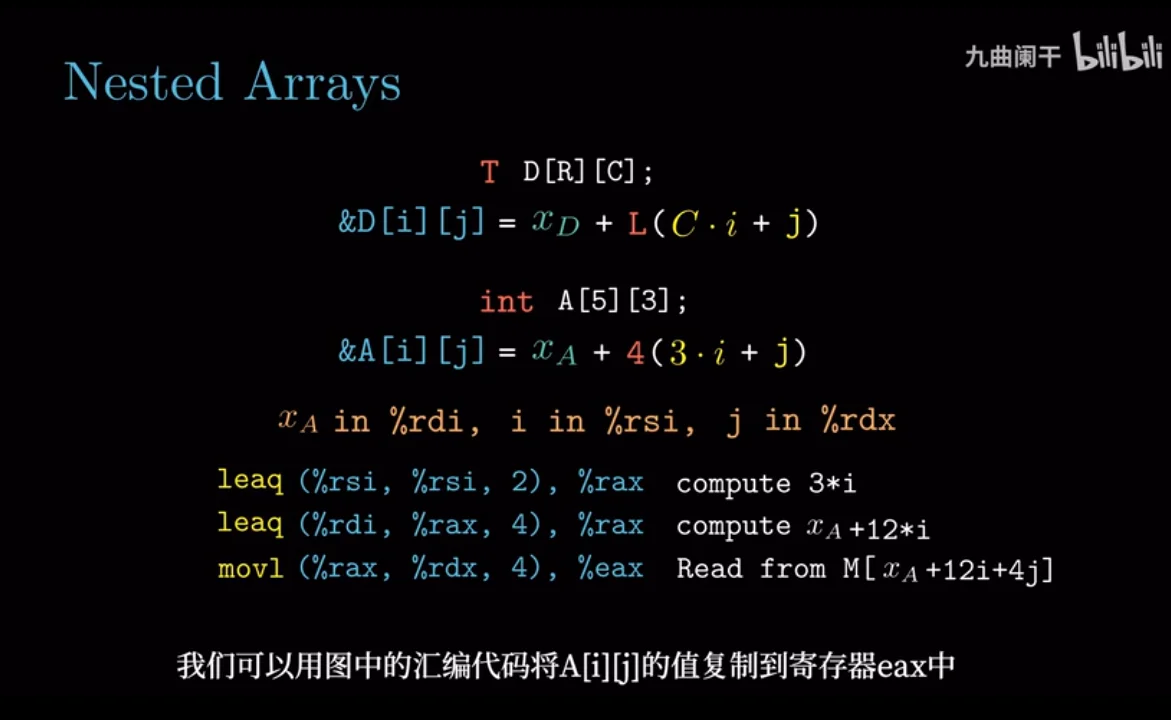 学习视频 3-8.数组的分配和访问 笔记 数组的移动是带着自己的基准值的 数组+1,加的是自己的类型对应的字节数 对指针的运算,计算结果根据指针引用的类型进行伸缩 对于数组,相关的运算的对应关系 纯字幕是起始地址,加括号是取值 嵌套数组在内存的排列方式 二维数组是行优先存储 寄存器表达 汇编访问数组元素,这里表示,两个数组的某行和某列的内积 变长数组