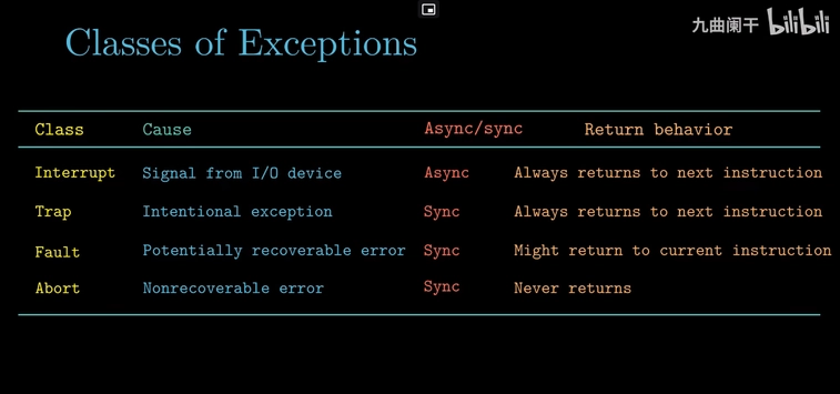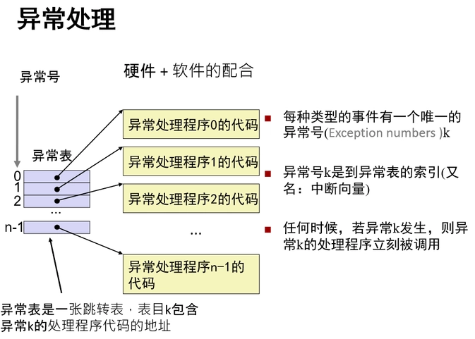 异常 异常是指为响应某个事件将控制权转移到操作系统内核中的情况 内核指操作系统常驻内存的部分 事件和异常 每种类型的事件对应一个唯一的异常号 k 异常号 k 是异常表的索引值、 当异常 k 发生,异常 k 的处理程序被立即调用 异常表是一张跳转表,表目 k 包含异常 k 的处理程序代码的地址