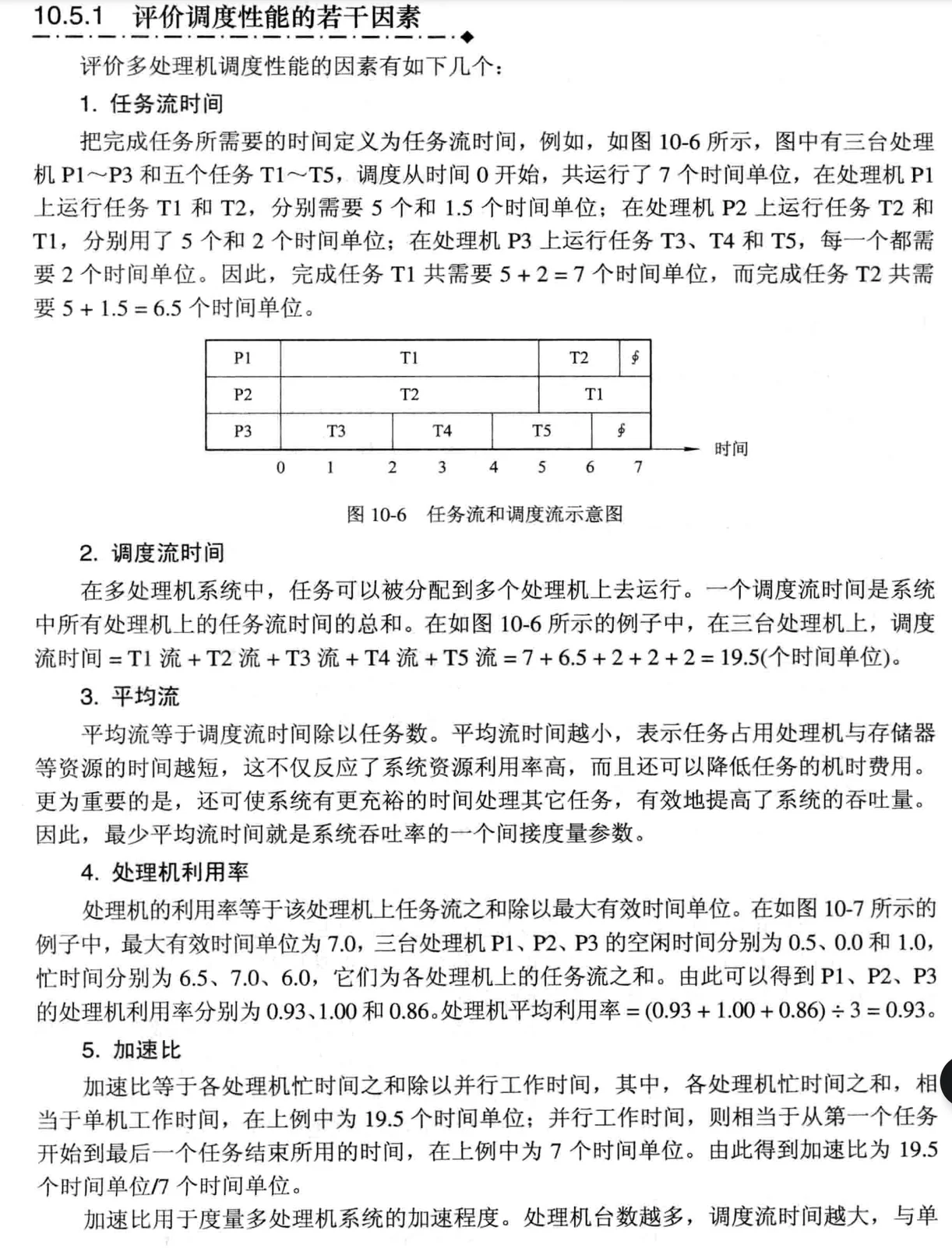 在多处理机系统中,任务可以被分配到多个处理机上去运行。一个调度流时间是系统中所有处理机上任务流时间的总和。在如图106所示的例子中,在三台处理机上,调度流时间 = T1流 + T2流 + T3流 + T4流 + T5流 = 7 + 6.5 + 2 + 2 + 2 = 19.5(个时间单位)。