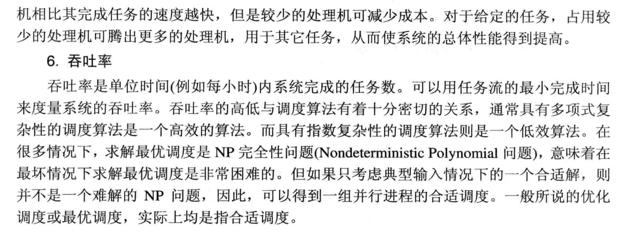 吞吐率是单位时间(例如每小时)内系统完成的任务数。可以用任务流的最小完成时间度量系统的吞吐率。吞吐率的高低与调度算法有着十分密切的关系,通常具有多项式复杂性的调度算法是一个高效的算法。而具有指数复杂性的调度算法则是一个低效算法。在很多情况下,求解最优调度是NP完全性问题(Nondeterministic Polynomial问题),意味着在最坏情况下求解最优调度是非常困难的。但如果只考虑典型输入情况下的一个合适解,则并不是一个难解的NP问题,因此,可以得到一组并行进程的合适调度。一般所说的优化调度或最优调度,实际上均是指合适调度。