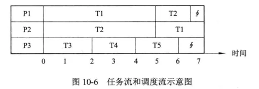 把完成任务所需要的时间定义为任务流时间,例如,如图10-6所示,图中有三台处理机P1P3和五个任务T1T5,调度从时间0开始,共运行了7个时间单位。在处理机P1上运行任务T1和T2,分别需要5个和1.5个时间单位;在处理机P2上运行任务T2和T1,分别用了5个和2个时间单位;在处理机P3上运行任务T3、T4和T5,每一个都需要2个时间单位。因此,完成任务T1共需要5+2=7个时间单位,而完成任务T2共需要5+1.5=6.5个时间单位。