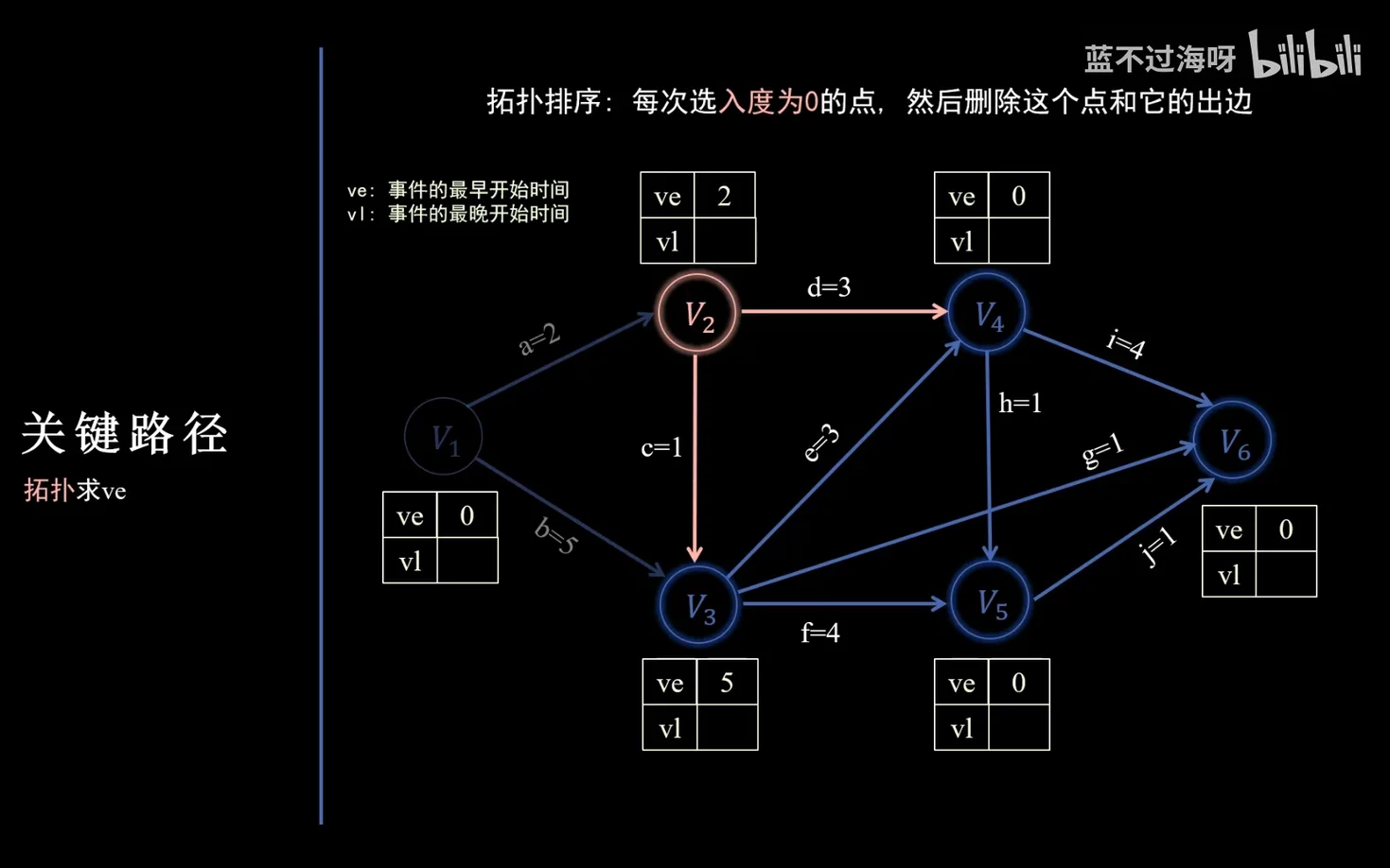 - 求所有事件(点)的最早发生时间 ve(vk):感觉像是松弛操作+拓扑排序的混合