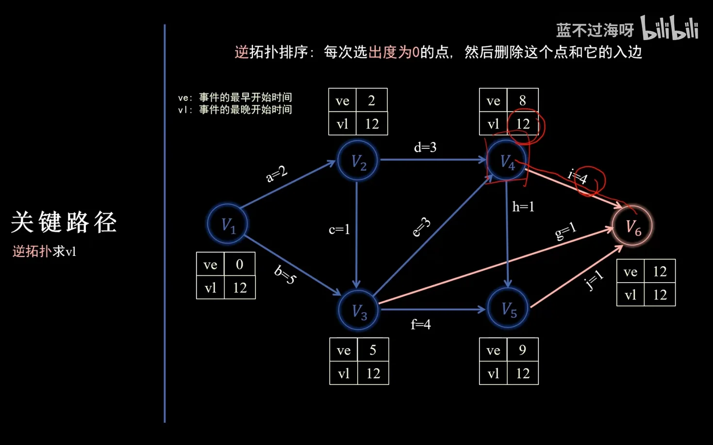 - 求所有事件的最迟发生时间 vl(vk):逆拓扑排序+松弛操作(做差取更小的)