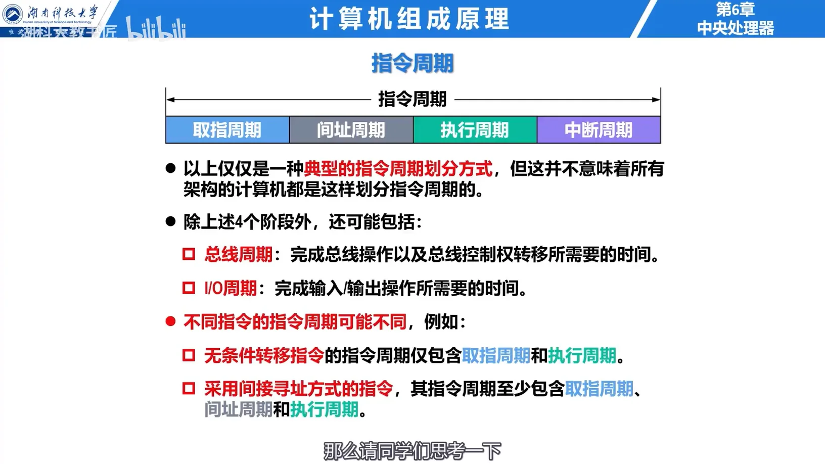 本讲,将介绍指令周期的相关知识。指令周期是指CPU从主存取出并执行一条指令所需的时间。对于无条件转移指令,仅包含取指阶段和执行阶段。需要指出的是,取指阶段还可能涉及到加密操作。