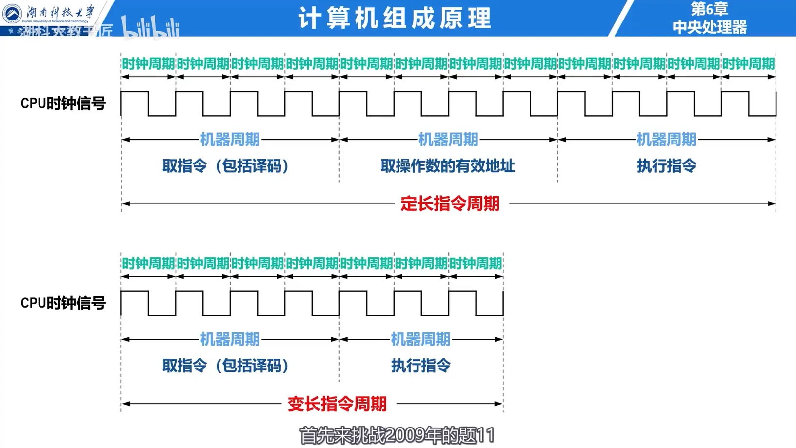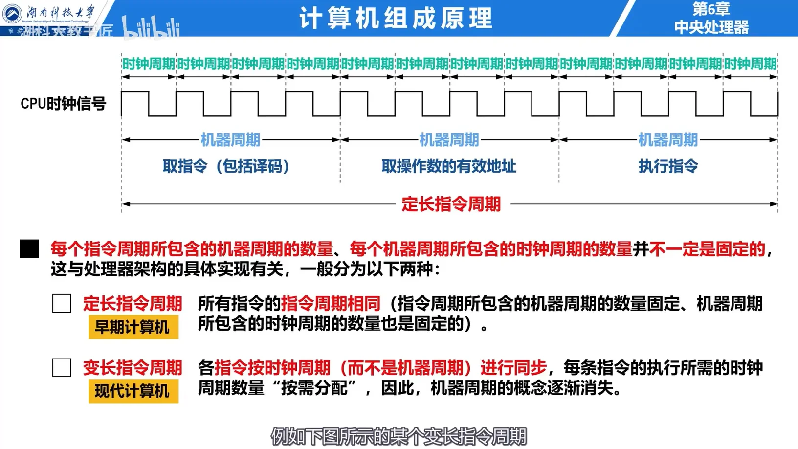 为了便于各指令同步,通常将指令周期划分为多个机器周期。机器周期,一般而言,指的是从主存取出一个存储字所需的最短时间,而每个机器周期又由若干个时钟周期组成。例如,在下图中,每4个CPU时钟周期构成一个机器周期,在这个机器周期阶段完成取指令的任务,在接下来的机器周期完成取操作数有效地址的任务,在再下一个机器周期完成执行指令的任务。因此,一个指令周期由三个机器周期构成,而每个机器周期又由4个CPU时钟周期组成。请同学们注意,不要把思维局限在本地上。