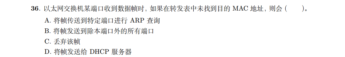 (例如 A 先向 B 发送一帧,从端口 1 进入到交换机。交换机收到帧后,先查找交换表,假设表中没有 B 的地址。于是,交换机把此帧的源地址 A 和端口 1 写入交换表中,并向除端口 1 以外的**所有端口广播这个帧。**广播发送可以保证让 B 收到这个帧,而 C 和 D 在收到帧后,因目的地址不匹配将丢弃此帧。)