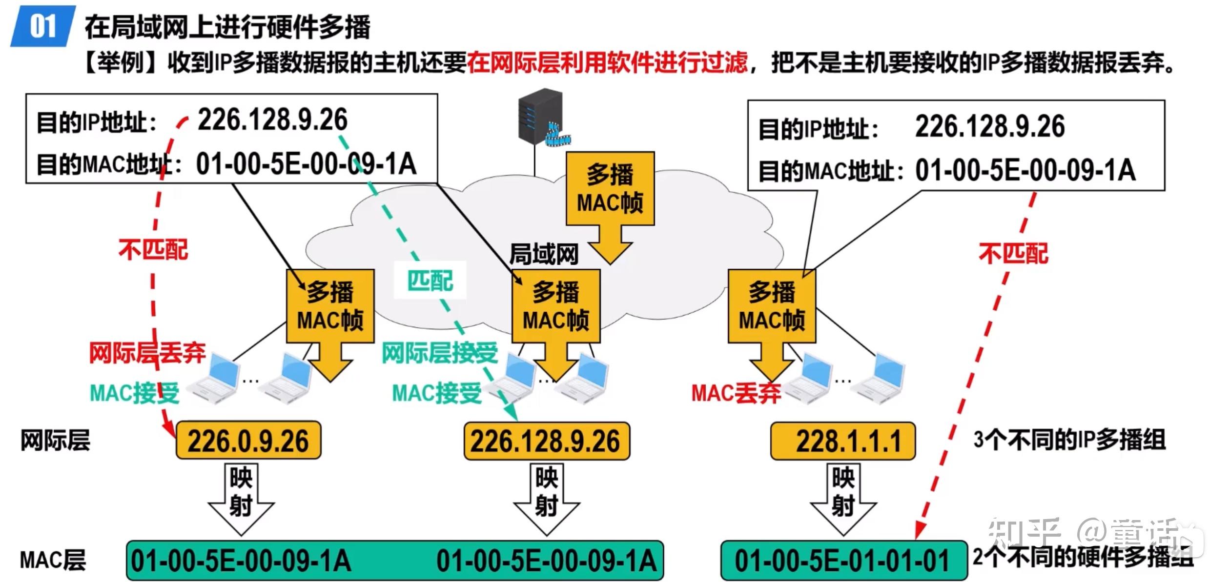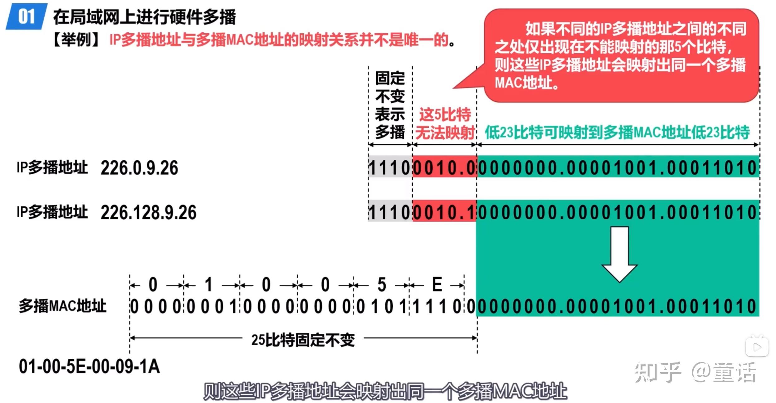 冷门点:IP 多播地址与多播 MAC 地址的**映射关系并不是唯一的,**因此收到多播数据报的主机,还要在 IP 层利用 IP 数据报首部的 IP 地址进行过滤,把不是本主机要接收的数据报丢弃。