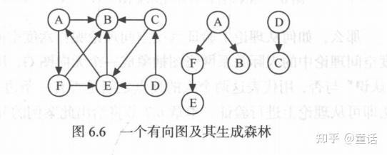 • 有向树和生成森林: 有一个顶点的入度为 0,其余顶点的入度均为 1 的有向图称为有向树。一个有向图的生成森林是由若干棵有向树组成,含有图中全部顶点,但只有足以构成若干棵不相交的有向树的弧。