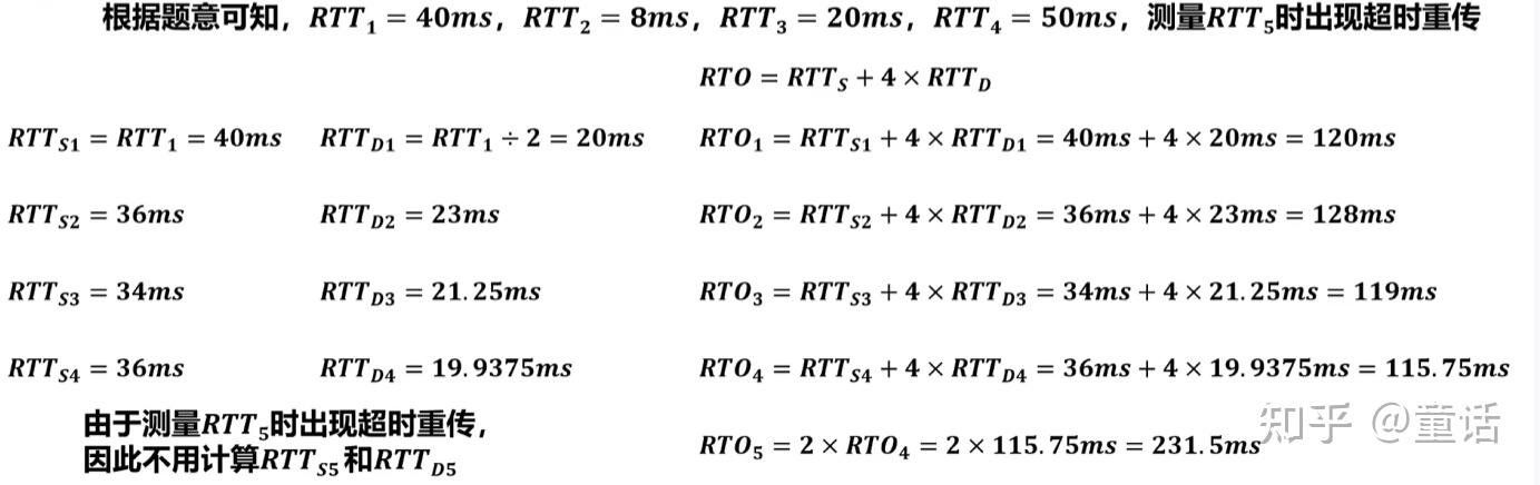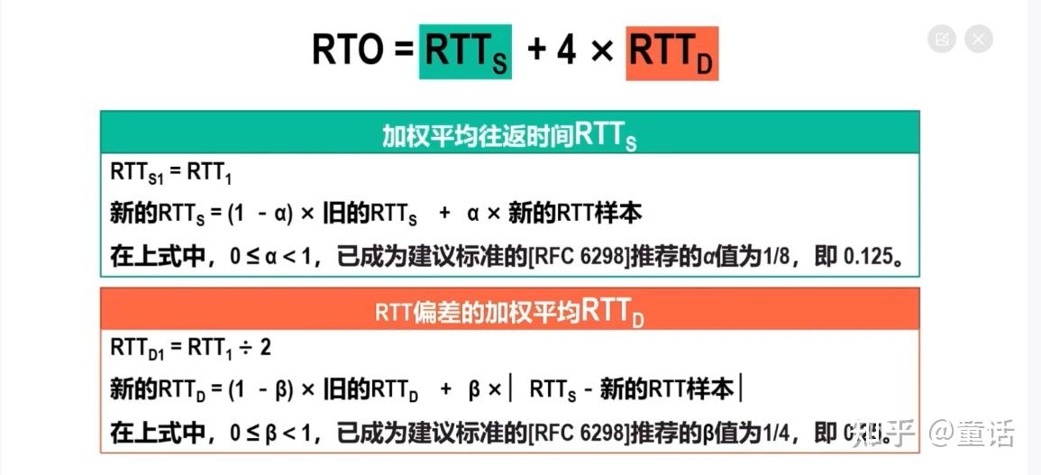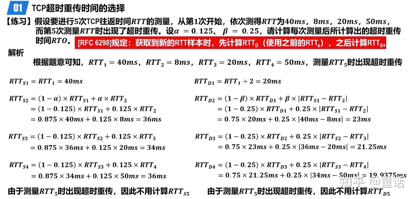 冷门点:TCP 超时重传时间 RTO 的选择。网络是动态的,RTT 的大小也会动态变化,不能直接使用略大于某次测量得到的往返时间 RTT 样本的值作为超时重传时间 RTO,可以利用每次测量得到的 RTT 样本计算加权平均往返时间 RTTs,这样可以得到比较平滑的往返时间。为了解决超时重传会导致 RTT 的计算出现偏差,报文段每重传一次,就把 RTO 增大一些,典型的做法是将新 RTO 的值取为旧 RTO 的 2 倍