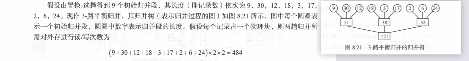 假设由置换-选择得到9个初始归并段,其长度(即记录数)依次为9, 30, 12, 18, 3, 17, 2, 6, 24。现作3-路平衡归并,其归并树(表示归并过程的图)如图8.21所示,图中每个圆圈表示一个初始归并段,圆圈中数字表示归并段的长度。假设每个记录占一个物理块,则两趟归并所需对外存进行读写次数为 (9+30+12+18+3+17+2+6+24) × 2 × 2 = 484