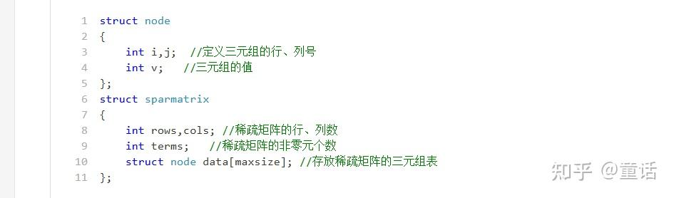 • 稀疏矩阵: 稀疏矩阵的三元组表既可以采用数组存储,又可以采用十字链表存储。当存储稀疏矩阵时,不仅要保存三元组表,而且要保存稀疏矩阵的行数、列数和非零元素的个数