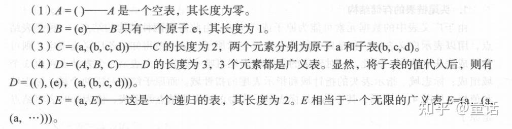 • 广义表:是另外一种线性表的推广形式,表中的元素可以是称为原子的单个元素,也可以是一个子表,所以线性表可以看成广义表的特例。广义表的结构相当灵活, 在某种前提下,它可以兼容线性表、数组、树和有向图等各种常用的数据结构。广义表通常采用链式存储结构头尾链表的存储结构和扩展线性链表的存储结构