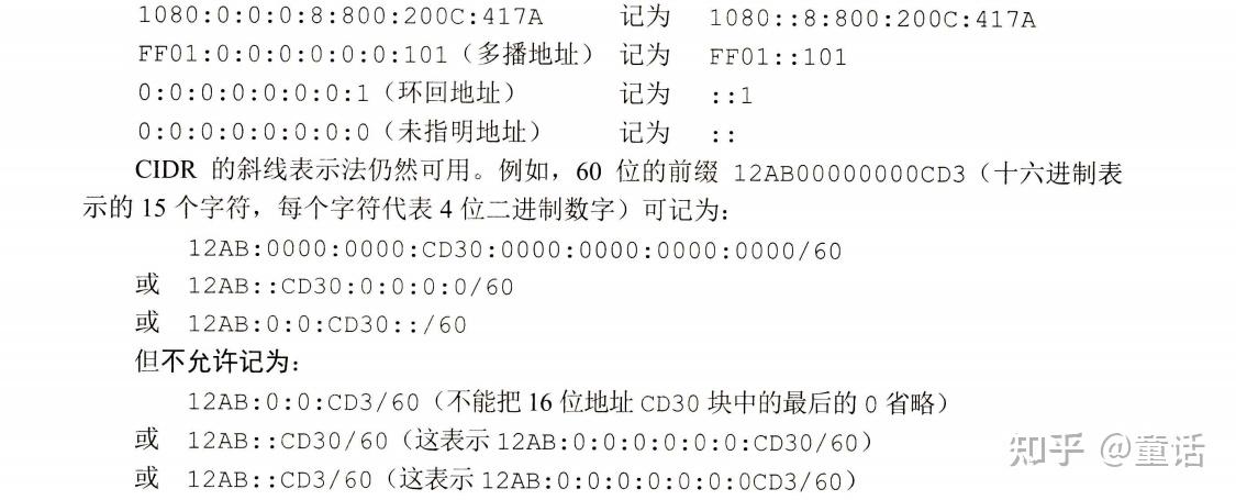(4)IPV6 地址的零压缩,(1)允许把数字前面的 0 省略,即一连串连续的零可以为一对冒号所取代(2)规定在任一地址中只能使用一次零压缩(也就是 “: :”