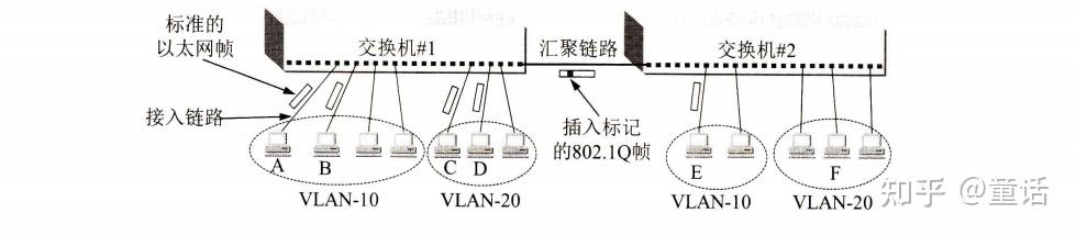 A→E,交换机 查到 E 并没有连接到本交换机,因此必须从汇聚链路把帧转发到交换机,但在转发之前,要插入 VLAN 标签。不插入 VLAN 标签,交换机 就不知道应把帧转发给哪一个 VLAN。因此在汇聚链路传送的帧是 802.1Q 帧。交换机 在向 E 转发帧之前,要拿走已插入的 VLAN 标签,因此 E 收到的帧就是 A 发送的标准以太网帧,而不是 802.1Q 帧