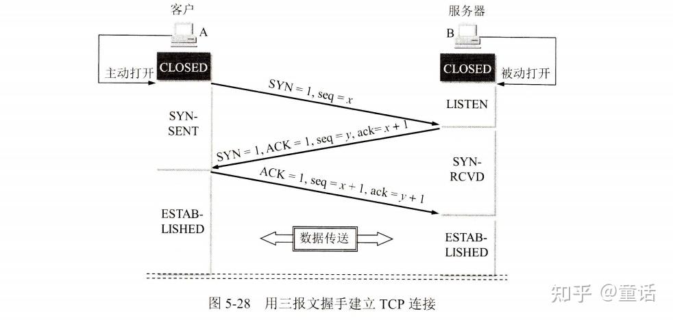 (2)TCP 的标准规定,ACK 报文段可以携带数据,但如果不携带数据则不消耗序号。(也就是第三次握手可以分为携带数据和不携带数据,例如 TCP 连接建立过程中,若 A 发送第一个报文段序号为 x ,A 发送的第二个 TCP 报文段携带了 100B 的数据,则 TCP 连接建立成功后,A 发送的第一个 TCP 报文段序号应该为 x+101