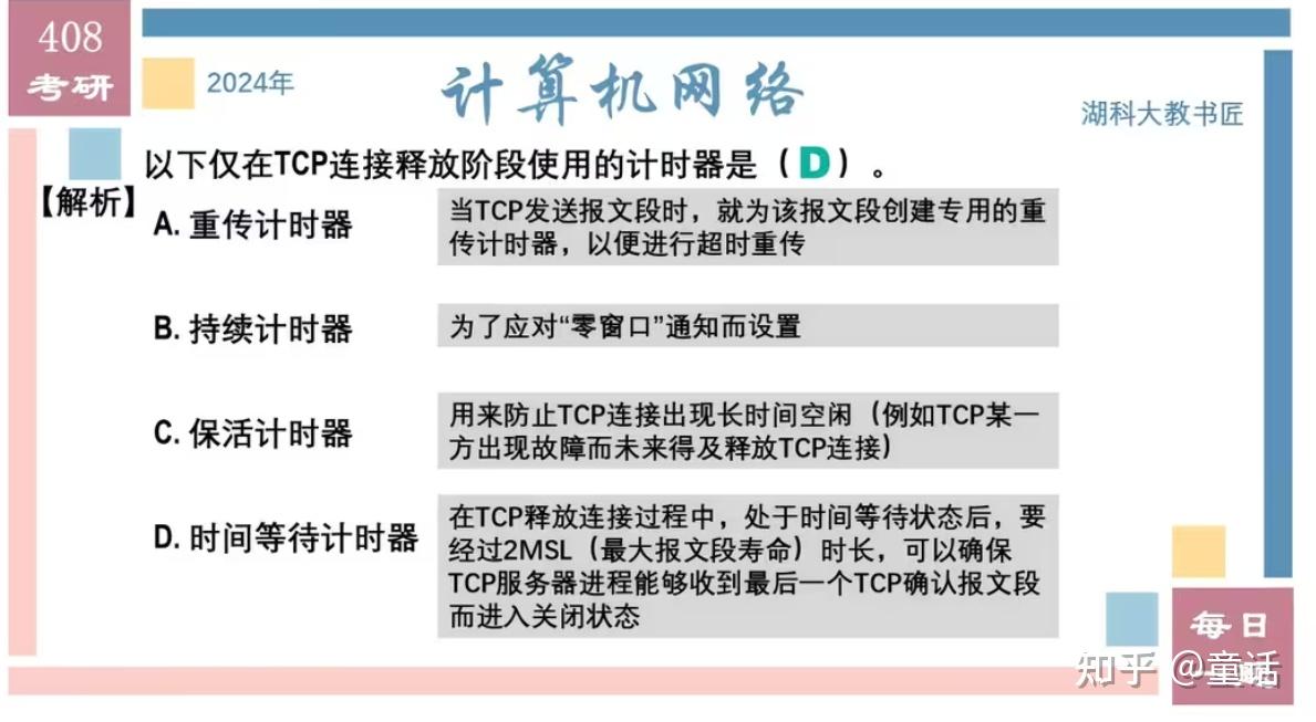 冷门点:TCP 保活计时器,用于防止两端的 TCP 连接在长时间处于空闲状态时出现问题。TCP 包活计时器超时,服务器会向客户端发送一个探测报文段,这个报文段用于检测客户端是否仍然存活,如果服务器在发送了多个(通常是 10 个)探测报文段后仍然没有收到客户端的响应,服务器会认为客户端已经出现故障,并终止这个 TCP 连接。(补充:P174 BGP 协议那部分还有个保持时间计时器 (Hold Timer)。路由器每收到一个 BGP 报文,这个计时器就重置一次,继续从 0 开始计时。如果在商定的保持时间内没有收到对等端发来的任何一种 BGP 报文,就认为对方已经不能工作了)