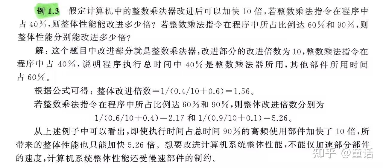• Amdahl 定律:对计算机系统的某一部分加速时,该加速部分对系统整体性能的影响取决于该部分的重要性和加速程度