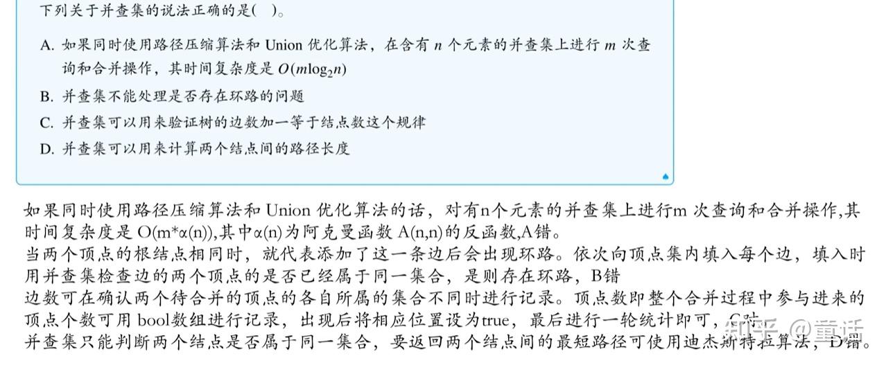 • 并查集 find 操作花费的时间与当前节点到根节点的路径长有关,没有采取优化时,平均时间复杂度为树高 O(lgn)、最坏为 O(n)(考试估计不会考这么细,如果题目没说采取哪种优化方式,最好 / 最坏情况,直接说并查集时间复杂度基本上是错的)