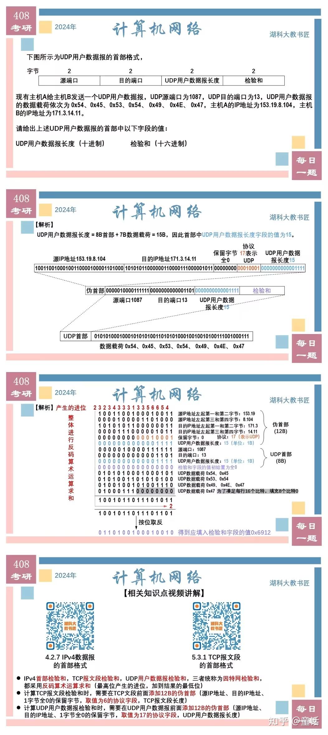 IP 校验只检查 ip 数据报的首部;udp 需要加上伪首部,再与首部和数据部分一起校验(见末尾列举的题目