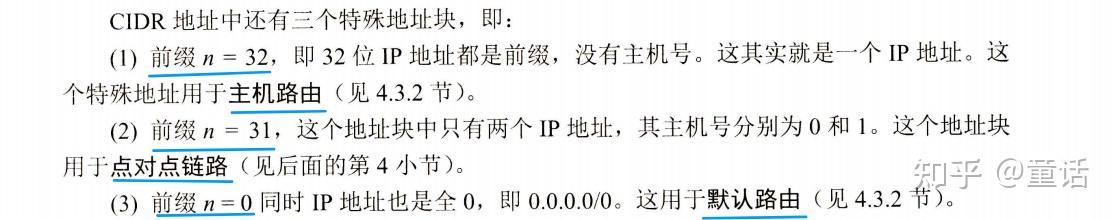 冷门点:CIDR 的三个特殊地址块,其中 n=31 可用于点对点链路,如两个路由器相连,但现在也不常常分配 IP 地址,这类特殊网络也叫无编号网络或匿名网络