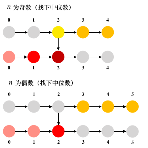 王道论坛出版的《计算机专业基础综合考试历年真题解析》或高等教育出版社出版的《全国硕士研究生招生考试计算机学科专业基础考试大纲》给的参考答案就是本方法的迭代写法,参考答案保存了首尾元素下标共计 4 个变量,并且分奇偶情况讨论,这版代码相比本人提供代码复杂一些。本人摘录如下,方便同学们自行对比。