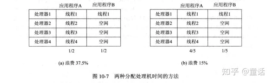 - 例如,有 4 台处理器及两个应用程序,其中,应用程序 A 中有 4 个线程,应用程序 B 中有一个线程。这样,每个应用程序可占用 4 台处理机一半 (1/2) 的时间。图 10-7(a)示出了此时处理器的分配情况。由图可看出,使用这种分配方式,在应用程序 A 运行时,4 台处理器都在忙碌; 而应用程序 B 运行时,则只有 1 台处理器忙碌, 其它 3 台空闲。因此, 将有 3/8 的处理器时间 (即 37.5%) 被浪费了。