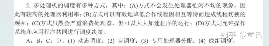 多处理机的调度有多种方式,其中:(A)方式不会发生处理器忙闲不均的现象,因此有较高的处理器利用率;(B)方式可以有效地降低合作线程因相互等待而造成线程切换的频率;(C)方式虽然会严重浪费处理器,但可以大大加速程序的运行;(D)方式则允许操作系统和应用程序共同进行调度决策。