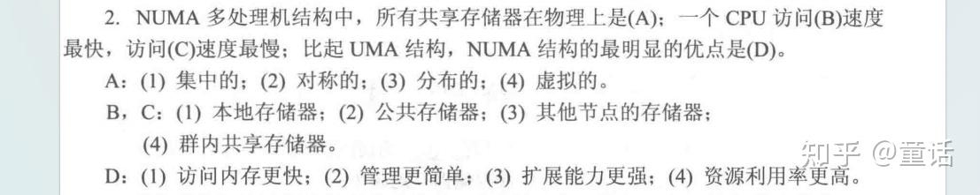 NUMA多处理机结构中,所有共享存储器在物理上是(A):一个CPU访问(B)速度最快,访问(C)速度最慢;比起UMA结构,NUMA结构的最明显的优点是(D)。