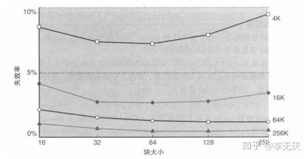 但如果相对于 cache 大小,块容量过大,实际上失效率会逐渐上升。