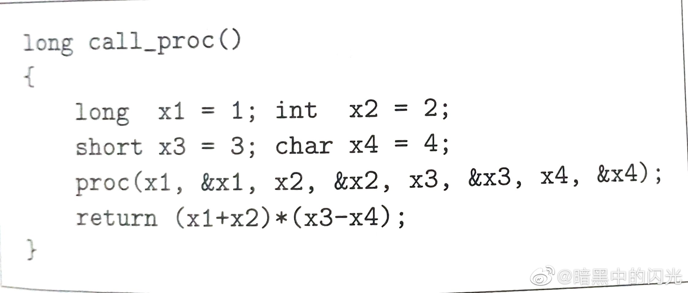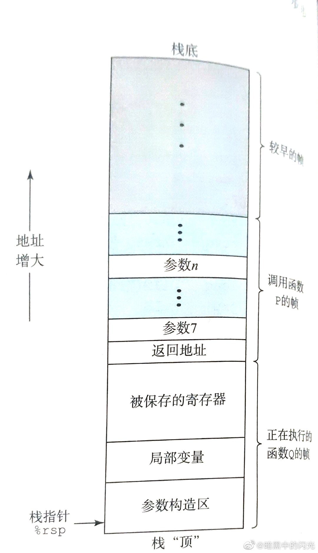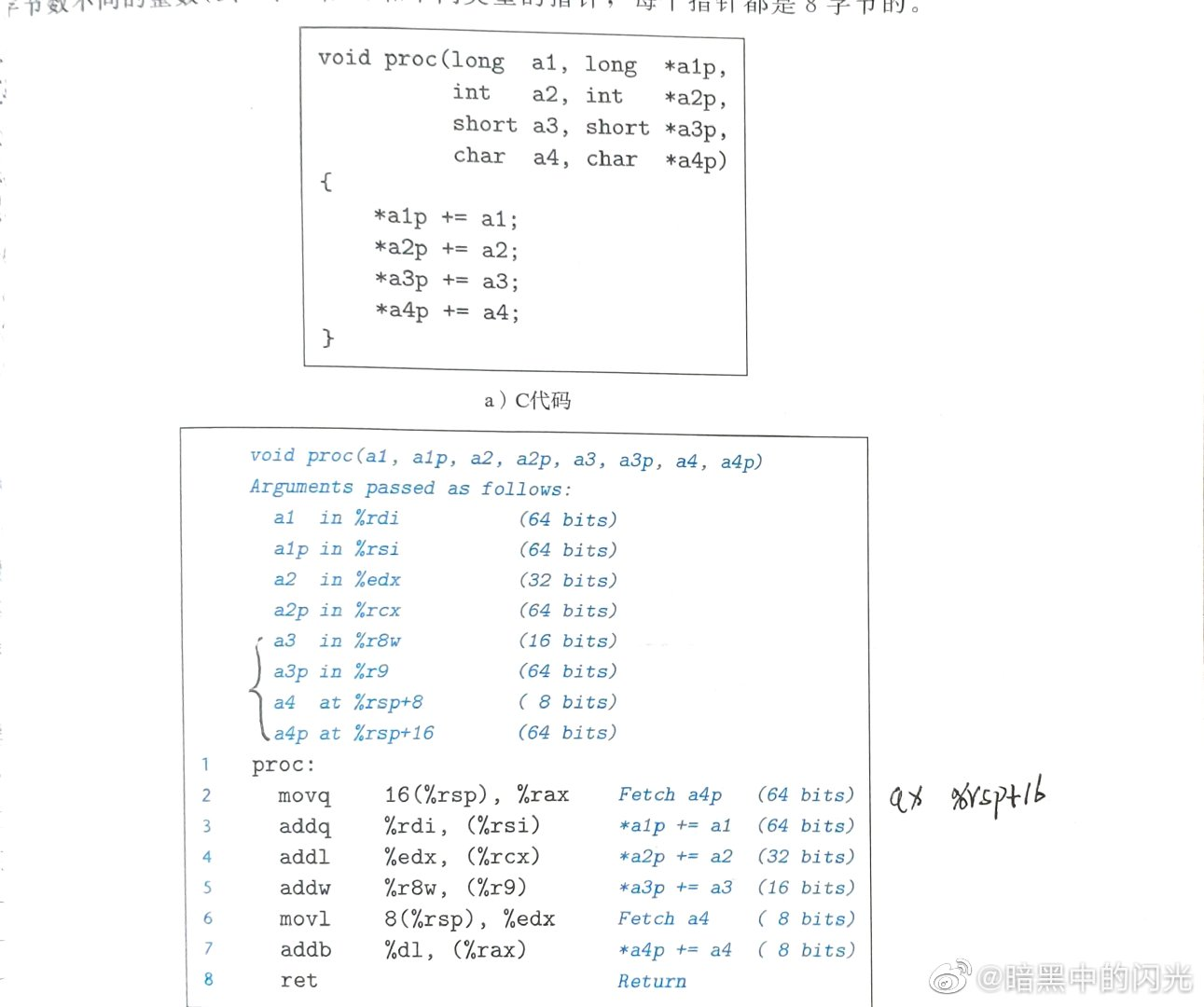 图片中 a4pa4 转移到 %rax%edx 数据来源于 16(%rsp)8(%rsp) , 所以 多出的参数以 push 操作的正常大小压入栈内,以此类推