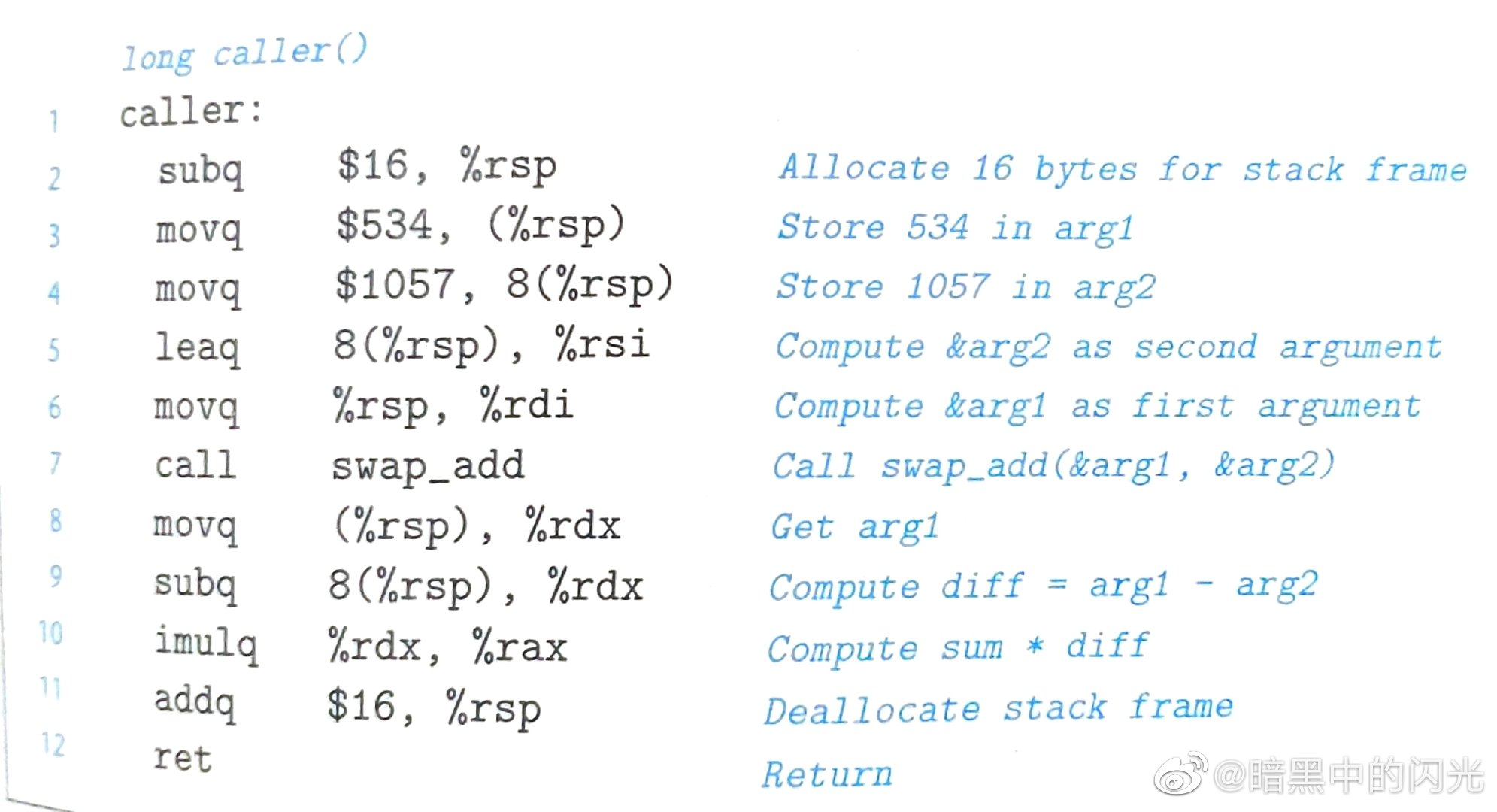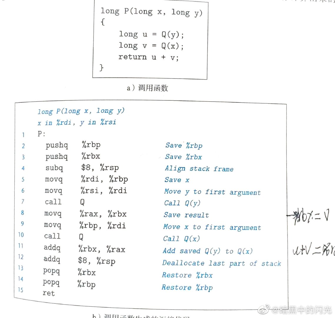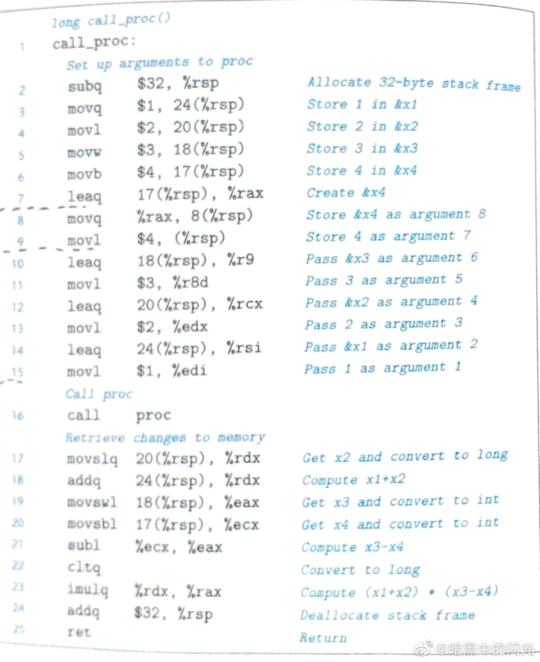 图片中 a4pa4 转移到 %rax%edx 数据来源于 16(%rsp)8(%rsp) , 所以 多出的参数以 push 操作的正常大小压入栈内,以此类推