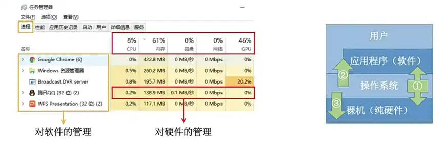 操作系统中对于软件以及硬件的管控可以看如下示例图,可以通过任务管理器来明确: