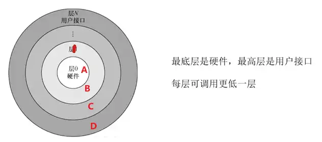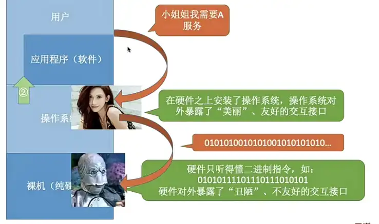 对于用户以及应用程序这些上层来说,我们只需要直接调用操作系统的接口即可 ,各个层之间的通俗易懂的关系如下所示: