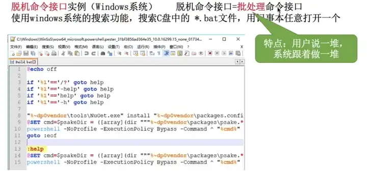 特点:将一系列的命令罗列在了一个 xx.bat 文件,用户提出一堆指令,操作系统跟着做一堆。