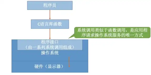 实际应用举例:通过编写 C 语言代码在屏幕上输出 “Hello World”,实际在 printf 函数的底层就使用到了操作系统提供的显式相关的 “系统调用”。