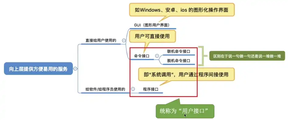 对于操作系统提供的服务主要是面向用户以及面向软件、程序的,对于用户来说可以使用 GUI 以及命令接口(cmd,xx.bat 文件),而对应程序员则是通过程序接口(通过去调用指定的系统函数来与操作系统交互)。
