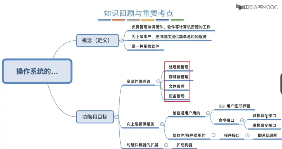 操作系统提供的功能:处理机功能、存储器功能、文件管理、设备管理。