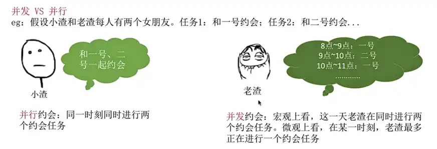 并发:指两个或多个事件在同一时间间隔内发生,这些事件在宏观上来看是同时发生的,但在微观上是交替发生的。