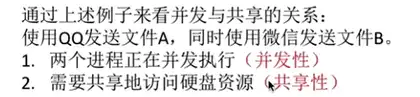 - 若是失去共享性,那么 QQ 与微信就不能够同时访问硬盘资源,那么即使能够进行并发也失去了意义。