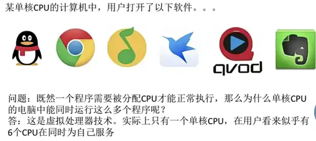 虚拟处理器器 - 时分复用技术:微观上处理机在各个微小的时间段内交替着为各个进程服务。
